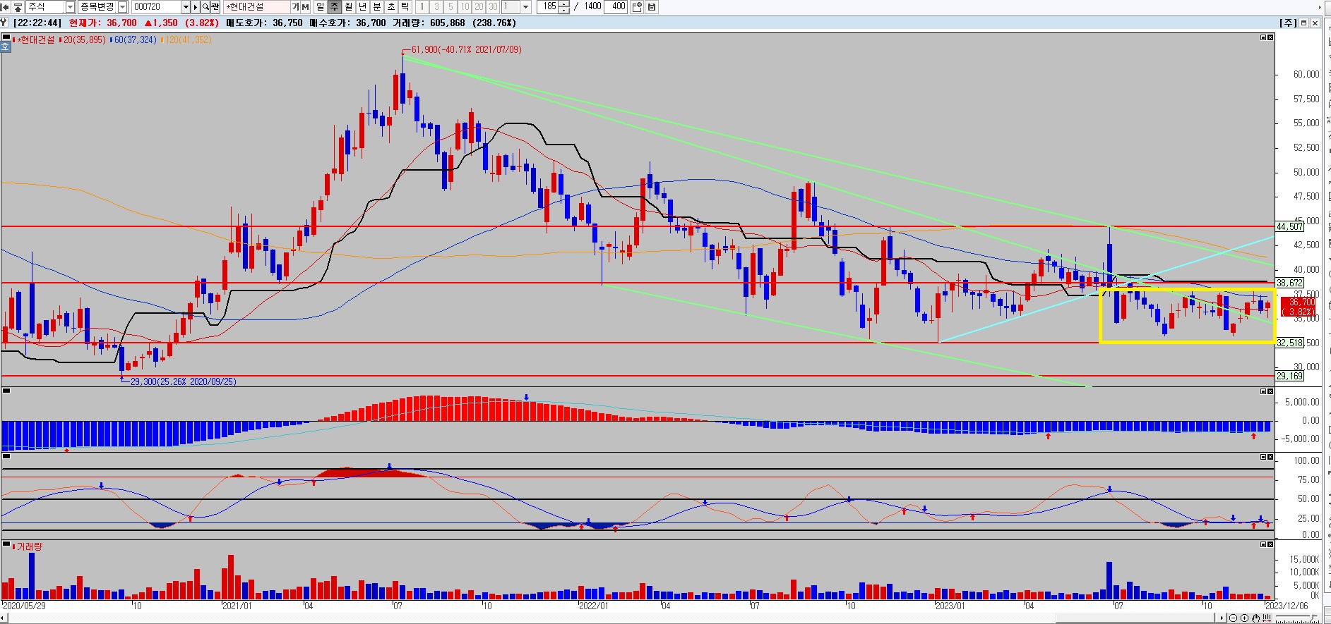 현대건설 주봉차트 입니다. 노란색 박스 보이시나요?