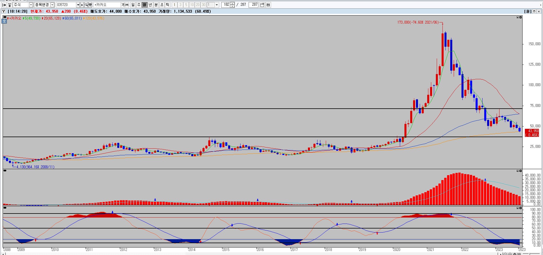 카카오 월봉차트를 보시면 아래쪽 지지라인은 지난 박스권에서 상단부인 36000원 라인 입니다