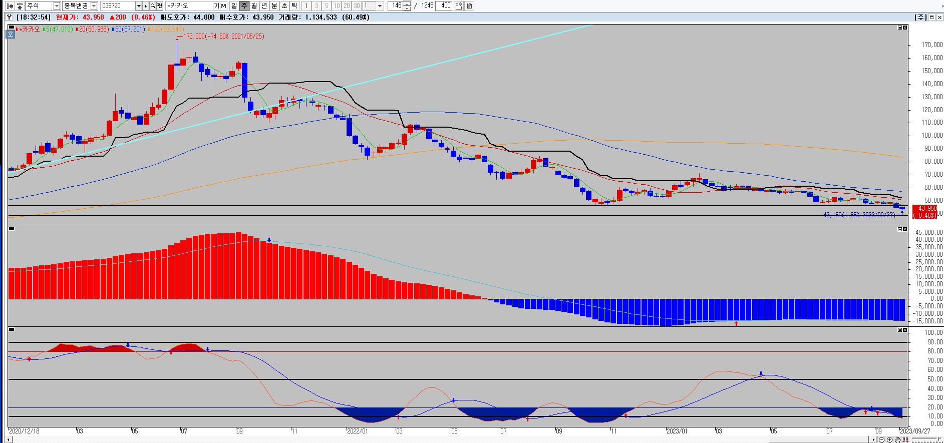 아직 36000원까지 내려가지 않았지만 현재 주가는 43950원
