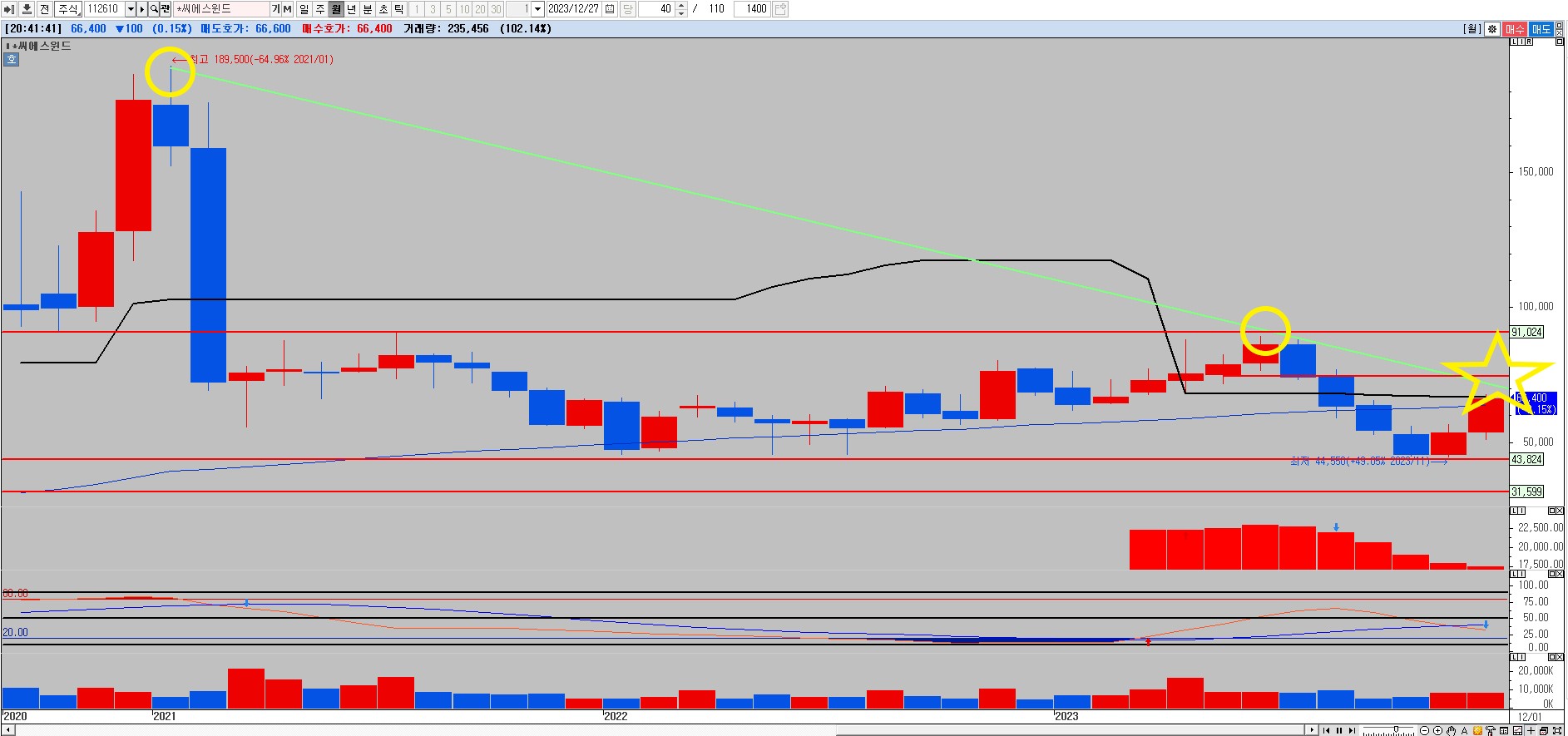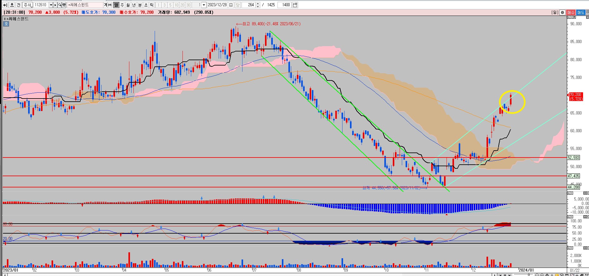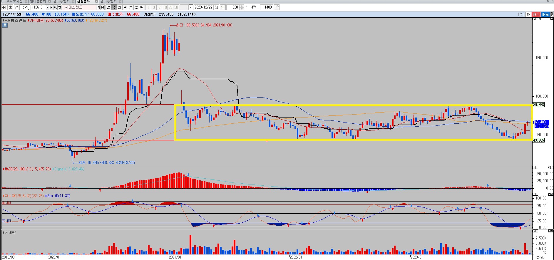 43800원 지지, 91000원 저항을 받고 있습니다.