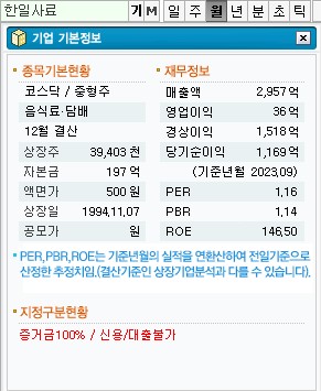 한일사료 일봉에서는 모든 이평선이 역배열 입니다.