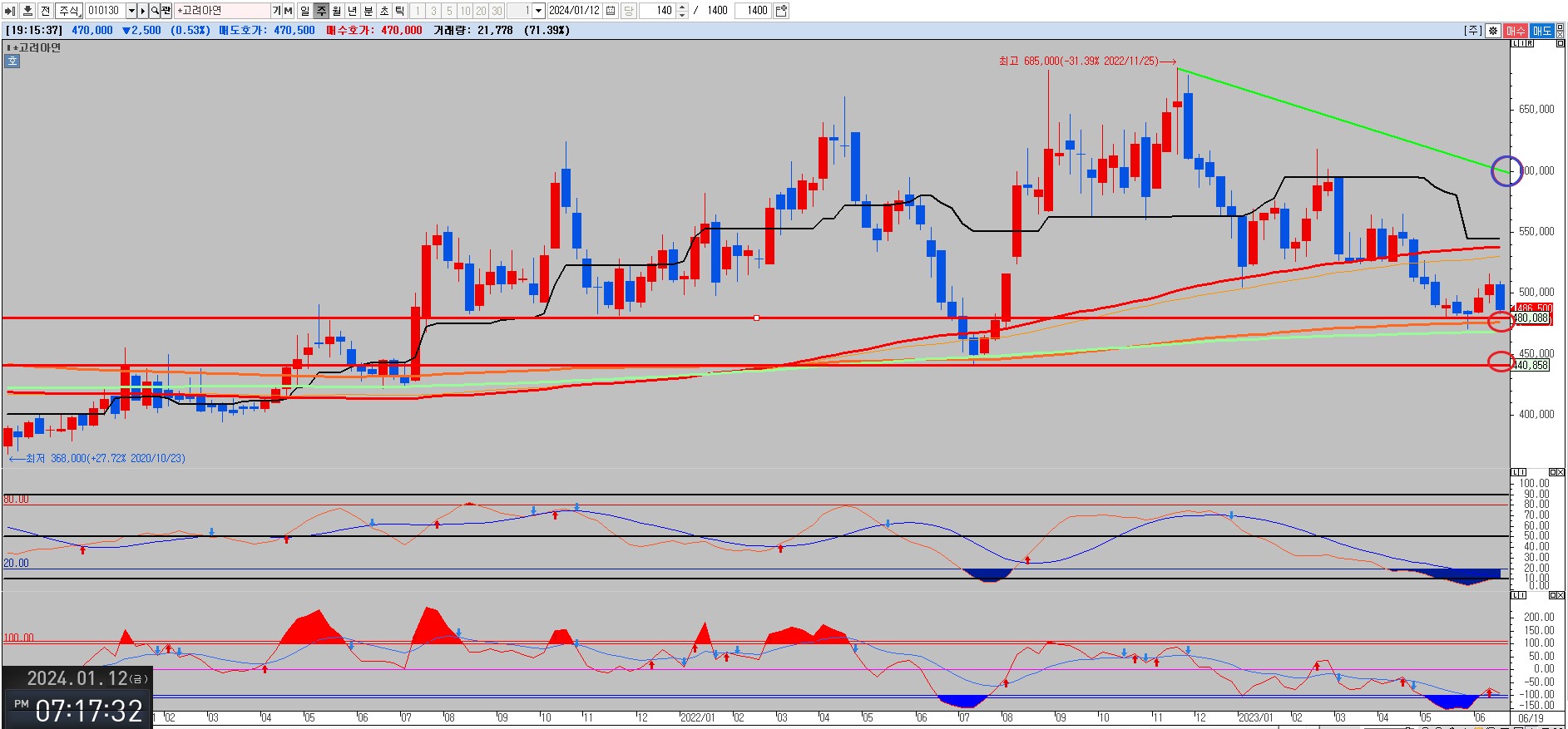고려아연 주봉차트에서 아래 445000원에