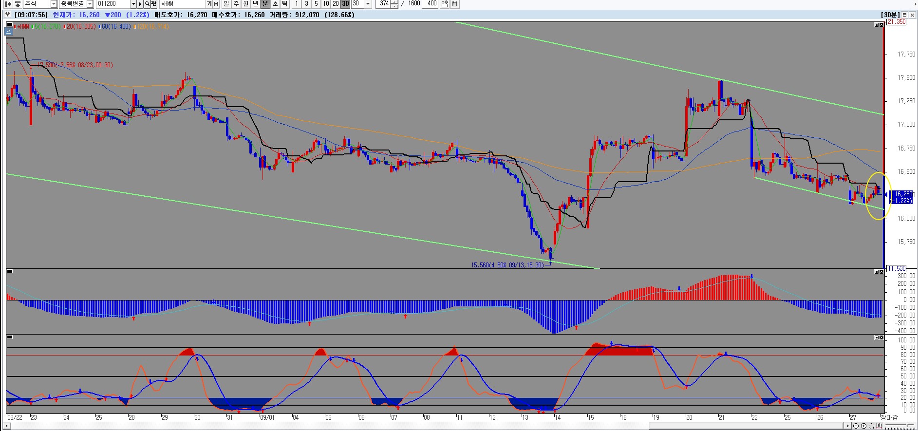 보조지표 파동은 천장쪽에 있고 추세는 매도세가 점점 줄어들고 있습니다