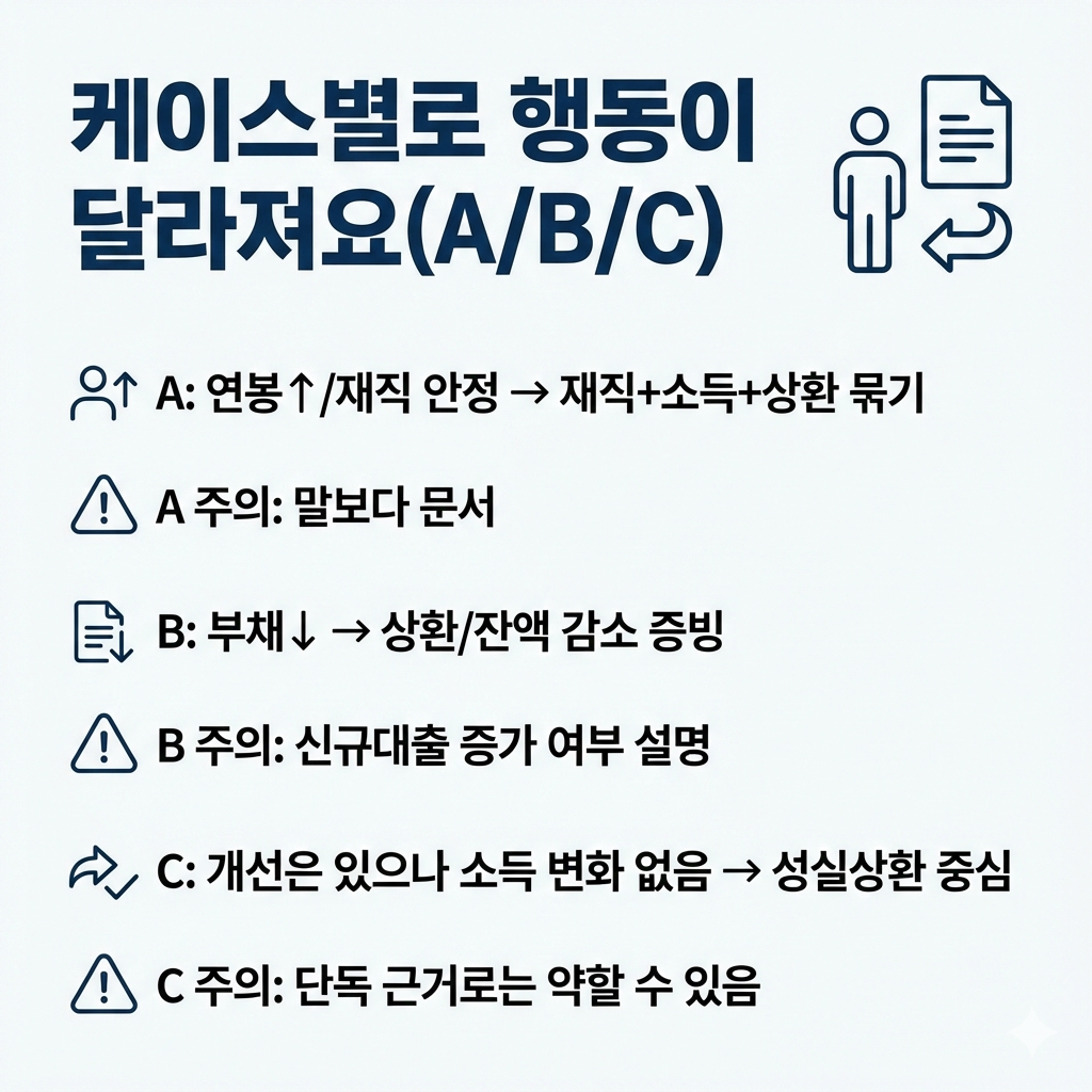 - 증빙 가능: 변화가 문서로 증명되는지(재직·소득·납부·상환 내역 등)